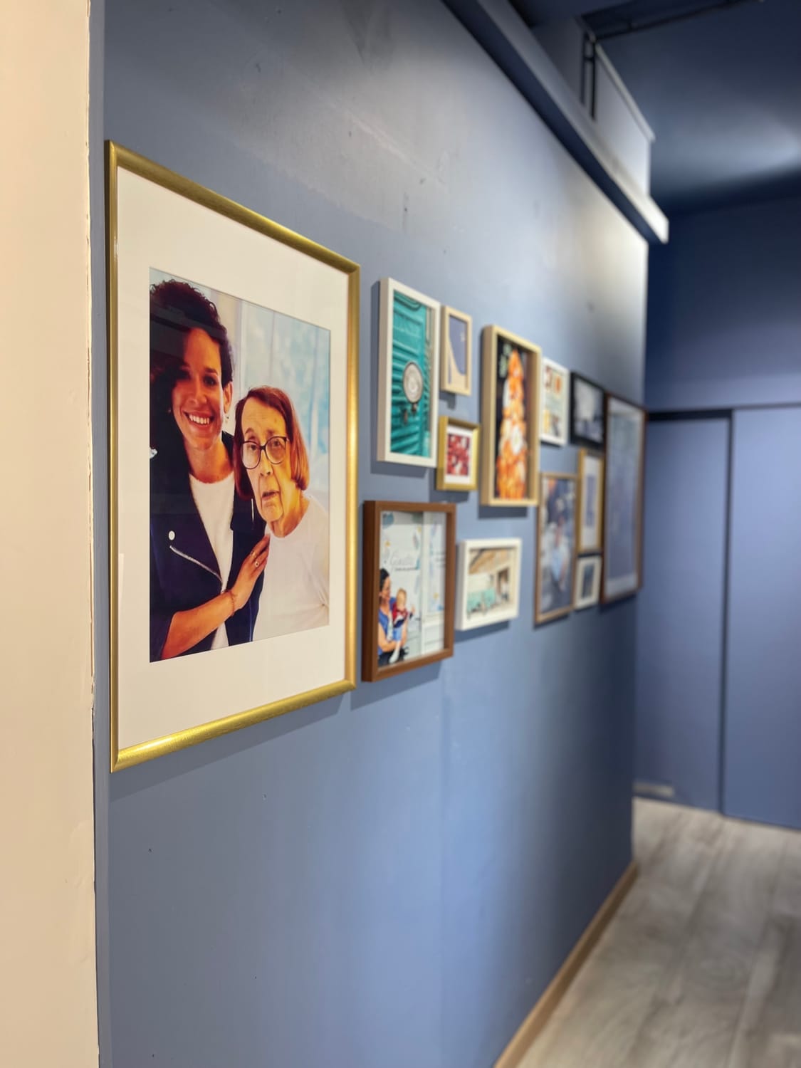 L'un des moments forts de ce projet a été la création du couloir menant aux espaces de service. Suite à une suggestion de Madison, nous avons conçu un mur de cadres composé de photos personnelles, choisies avec soin. Ce n'est pas juste de la décoration, c'est l'histoire de Ginette qui s'affiche, créant un lien immédiat et sincère avec les clients.