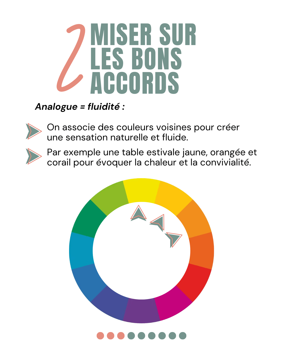 Jouer l’harmonie avec des couleurs proches (par exemple vert et jaune-vert).
