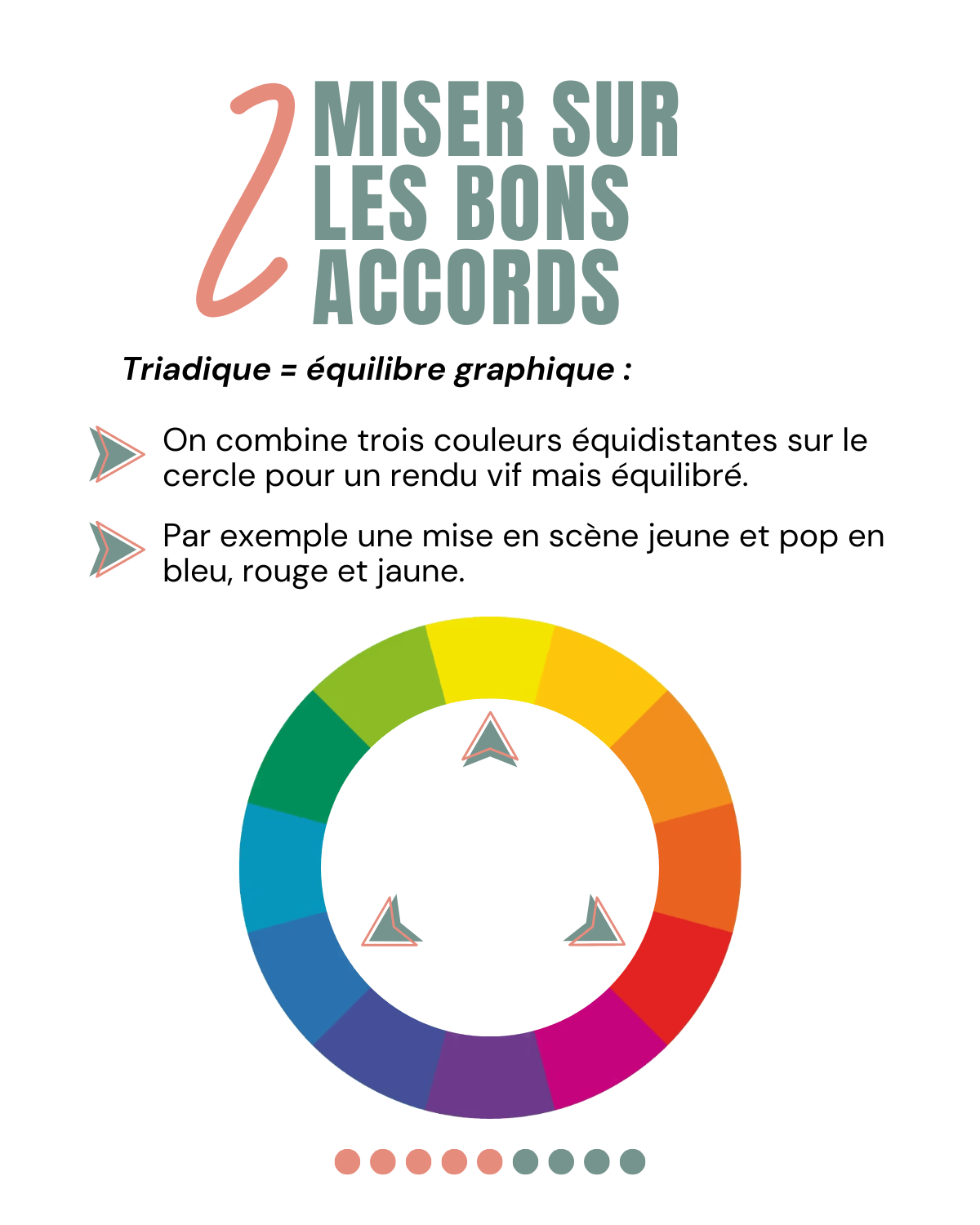 Les triadiques : trois couleurs équidistantes sur le cercle, parfaites pour créer de la vitalité et du rythme.