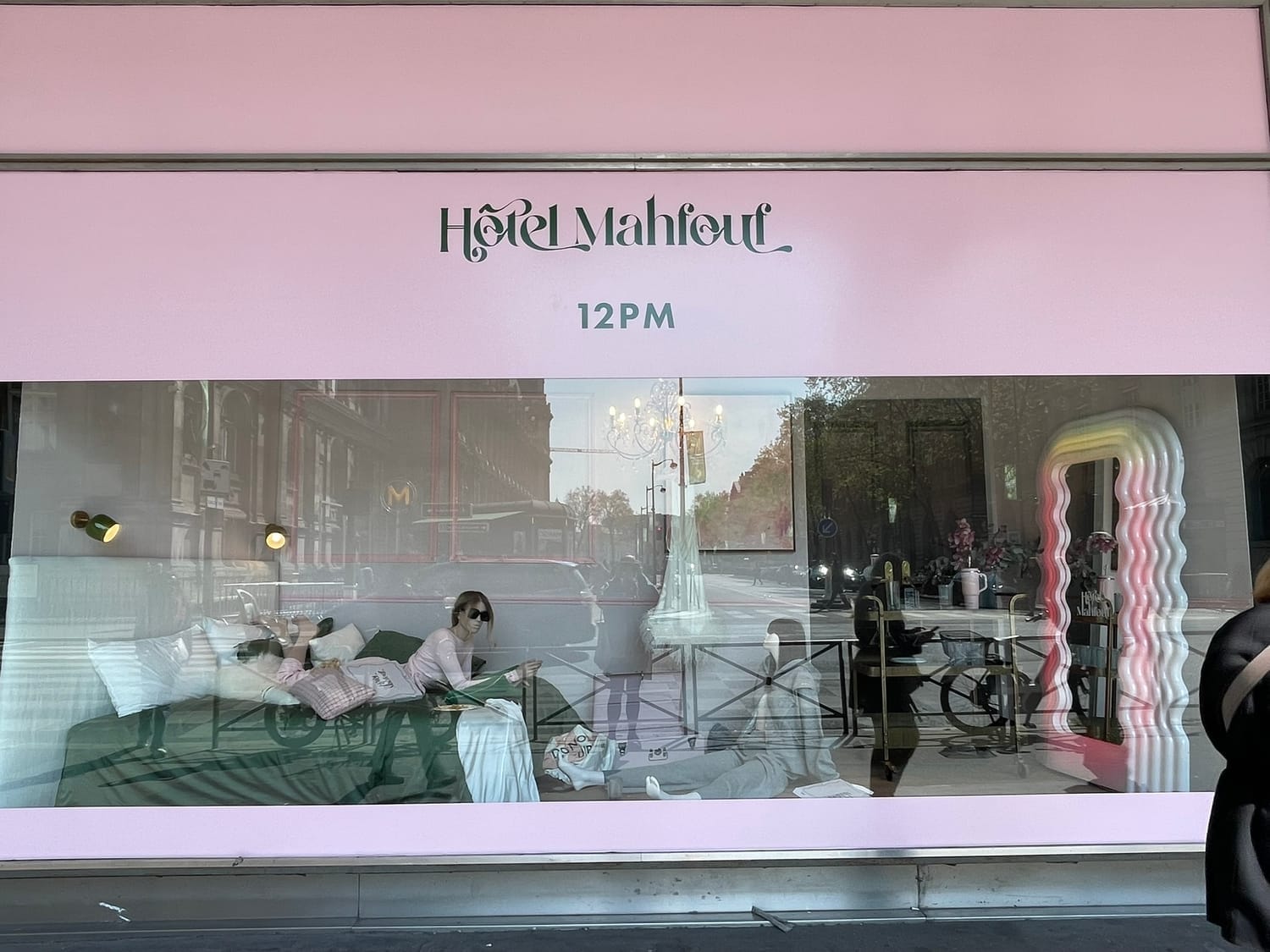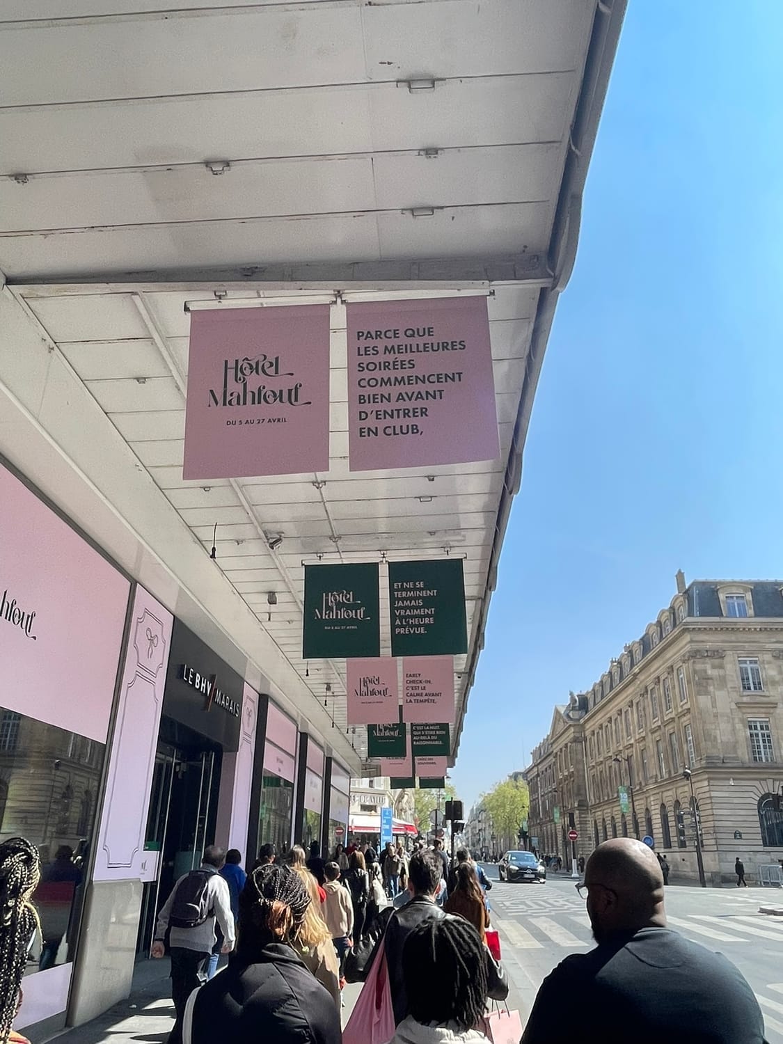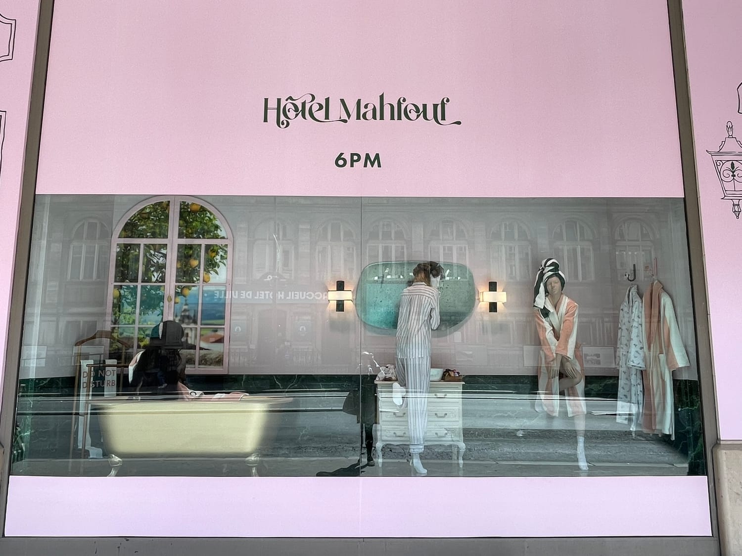 La façade est recouverte de rose, les fanions suspendus au-dessus de l’entrée renforcent l’effet immersif et festif. Dès les vitrines, on est projeté dans l’univers Hôtel Mahfouf : une scène vivante, presque cinématographique, qui capte l’attention et plante le décor.