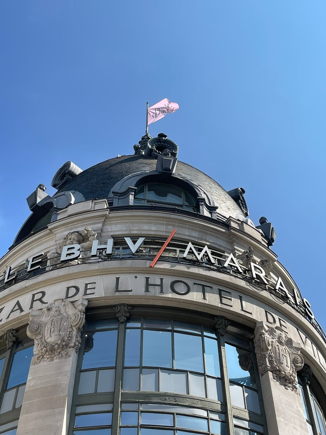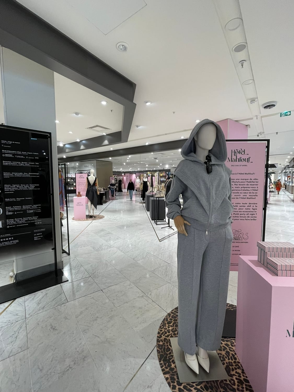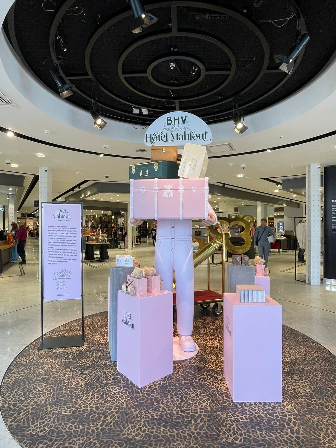 La façade est recouverte de rose, les fanions suspendus au-dessus de l’entrée renforcent l’effet immersif et festif. Dès les vitrines, on est projeté dans l’univers Hôtel Mahfouf : une scène vivante, presque cinématographique, qui capte l’attention et plante le décor.